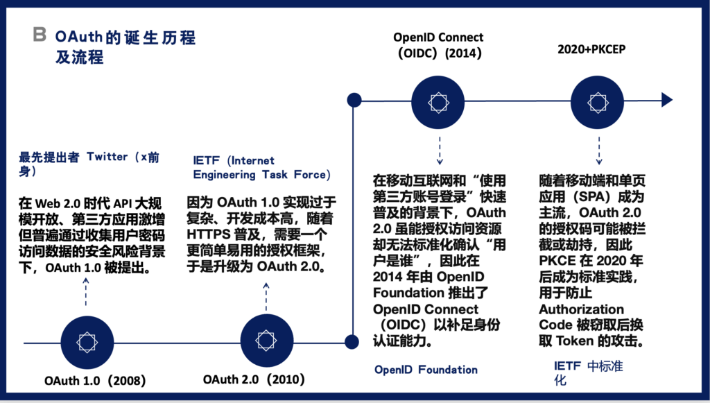 | 2014年2月 February 2014 | OpenID Connect 1.0正式发布,Google成为首批实施者 OpenID Connect 1.0 officially released, Google among first implementers | OIDC: 在OAuth 2.0上增加身份层,标准化用户信息 Identity layer on OAuth 2.0, standardized user info | [3] Sakimura, N., et al. (2014). OpenID Connect Core 1.0. |