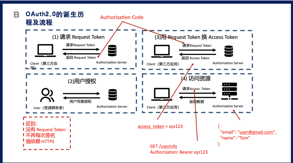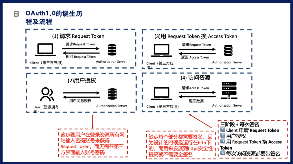 | 2007年12月 December 2007 | OAuth 1.0草案在OAuth Summit上首次提出,Twitter、Google、Yahoo等公司参与制定 OAuth 1.0 draft first proposed at OAuth Summit with participation from Twitter, Google, Yahoo | OAuth 1.0: 基于签名的授权机制,解决密码共享问题 Signature-based authorization mechanism, solving password sharing | [1] Hammer-Lahav, E. (2007). OAuth Core 1.0. OAuth Community. |